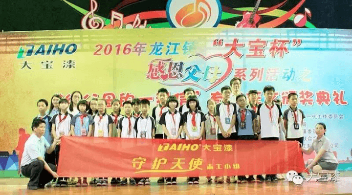5月20日,由佛山龍江鎮(zhèn)教育局、龍江鎮(zhèn)關(guān)心下一代委員會與大寶漆共同主辦的2016年龍江鎮(zhèn)“大寶杯”感恩父母系列活動(dòng)之“給父母的一封信”有獎(jiǎng)?wù)魑念C獎(jiǎng)典禮在龍江鎮(zhèn)城區(qū)中心小學(xué)舉辦。佛山龍江鎮(zhèn)教育局和龍江鎮(zhèn)關(guān)心下一代委員會在頒獎(jiǎng)典禮上授予大寶漆“博愛慈懷熱心公益”稱號。大寶化工企劃部楊忠榮副理、龍江鎮(zhèn)關(guān)心下一代工作委員會麥煥橋主任、獲獎(jiǎng)小學(xué)生及其家長出席了本次頒獎(jiǎng)典禮。