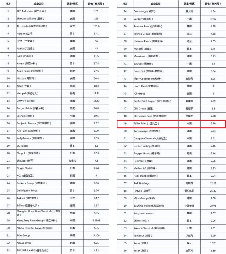 2020全球頂級(jí)涂料制造企業(yè)銷售額排行榜(前66名)