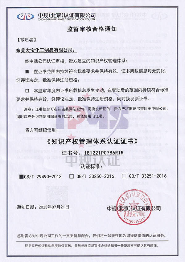 大寶化工作為國家知識產(chǎn)權(quán)優(yōu)勢企業(yè),長期致力于研產(chǎn)銷“建筑涂料、木器涂料、金屬涂料、塑膠涂料”,得益于公司重視專業(yè)、創(chuàng)新的經(jīng)營理念,致力于知識產(chǎn)權(quán)等工作的不懈努力,近期在知識產(chǎn)權(quán)工作方面取得了顯著進展。