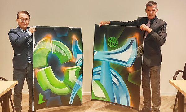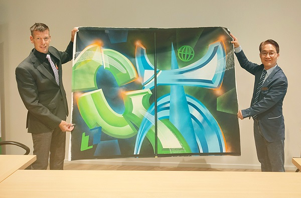 此次簽約儀式別具創(chuàng)意與情感意義,高樂(lè)伯總裁Kees特別邀請(qǐng)當(dāng)?shù)刂嫾乙浴癎”與“T”兩個(gè)字母為主題,分別代表Global Paint與Taiho Paint,創(chuàng)作一幅融合東西方藝術(shù)語(yǔ)匯的油畫作品。簽約當(dāng)日,雙方代表共同剪下畫作中央,各自保留一半,象征兩家企業(yè)跨越地域、文化的深度連結(jié)。
