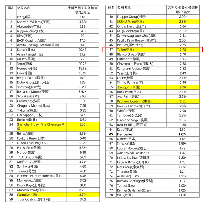 2018年全球頂級涂料制造企業銷售額排行榜(前78名)