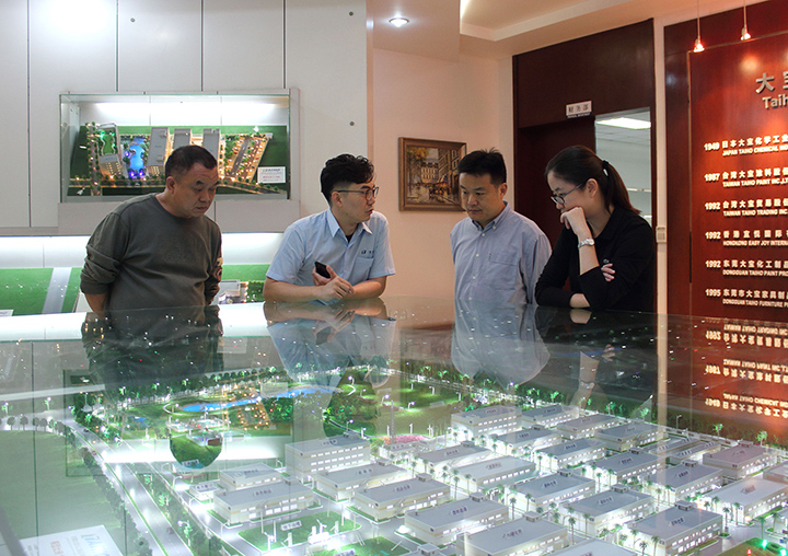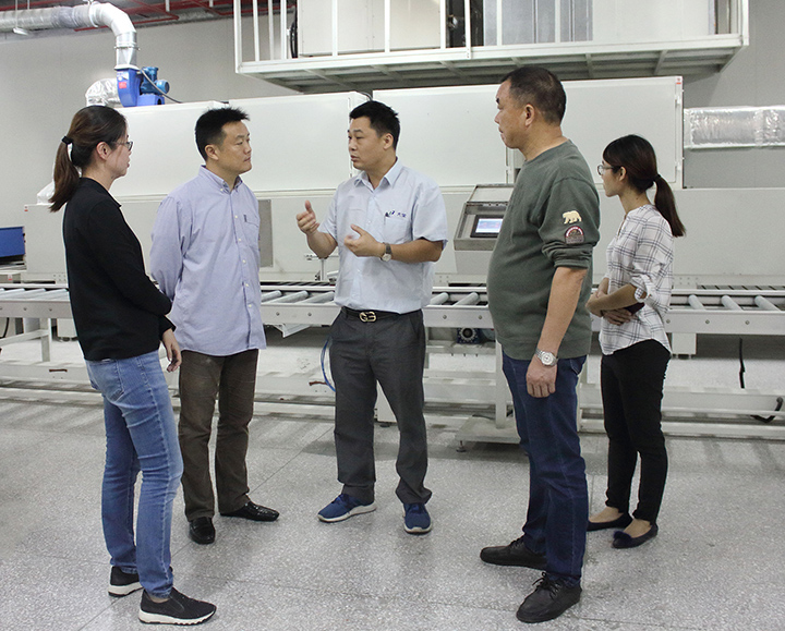 到訪領導一行還參觀了東莞大寶化工現代化的廠房設備、智能化涂裝線、一流的中央實驗室和展示家具漆產品完美施工效果的色板中心等地,增進了彼此的了解和進一步合作的信心。針對“油改水”問題,工作人員向參訪人員介紹了大寶漆水性漆的工藝和質量控制情況,詳細回答了馬總、李總一行對智能涂裝線的提問??疾烊藛T對大寶漆先進的生產管理和環保理念給予了高度評價。