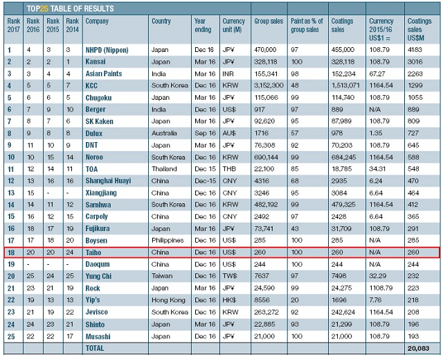 2017年亞太地區(qū)涂料企業(yè)排名前25強榜單