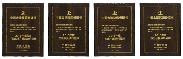 會議頒發了在多個細分渠道領域的2016年度杰出涂料品牌,大寶漆憑借其臻于至善的品質及消費者的支持,榮膺2016年度杰出“油改水”戰略合作伙伴、杰出木器裝修涂料品牌、杰出家具涂料品牌、杰出水性涂料品牌等4項大獎。同時,大寶漆經銷商杭州啟納實業有限公司獲得了2016年度杰出家具涂料經銷商獎項。大寶漆獨攬5個獎項,收獲頗豐。
