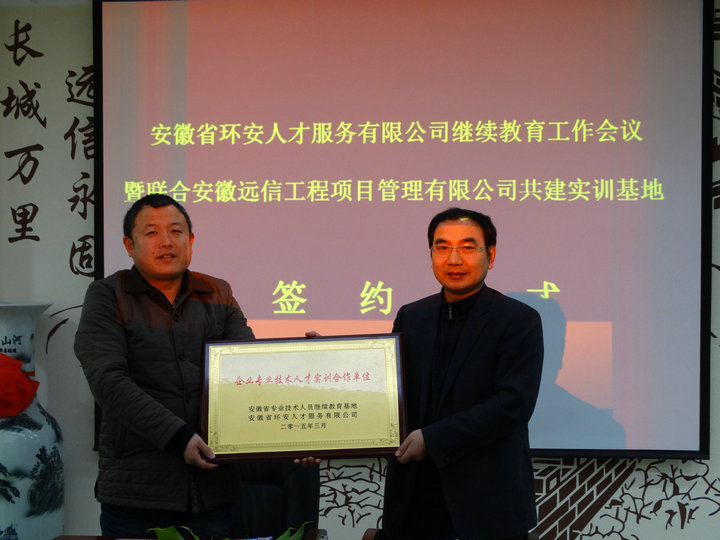 3月18日,安徽省環安人才服務有限公司繼續教育會議暨與安徽遠信工程項目管理有限公司共建實訓基地簽約儀式在公司會議室隆重召開。省人社廳專業技術人員管理處處長羅志年、副處長司永純、調研員吳偉等領導蒞臨會議并作重要講話。省繼續教育協會副秘書長、安徽環安人才服務有限公司總經理葉松,公司董事長余松林、總經理朱敏、常務副總兼總工郝傳山等相關人員出席會議。會議由環安人才服務有限公司培訓部(繼續教育基地辦公室)負責人毛奇主持。