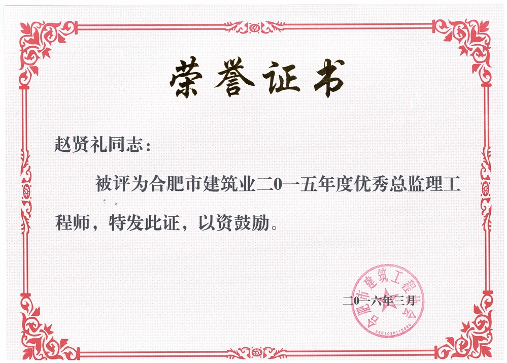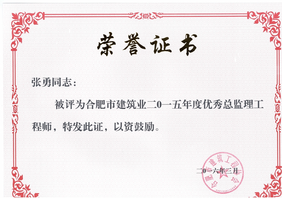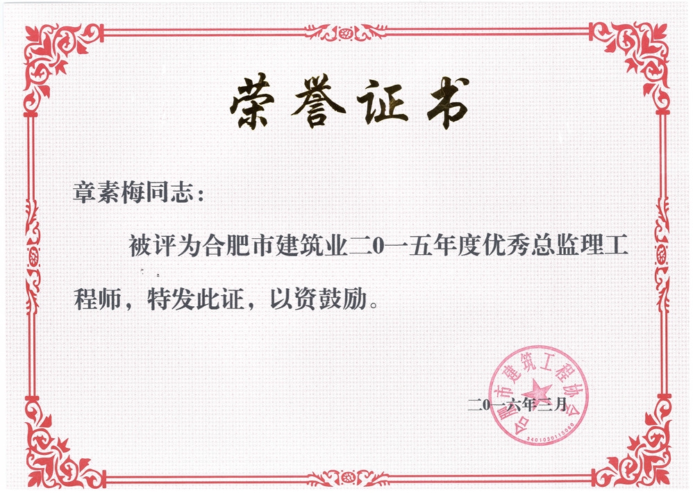近日,合肥市城鄉建設委員會正式發布《關于表彰全市建筑業2015年度優秀企業、單項先進企業、先進個人的決定》,公司被評為“合肥建筑業2015年度優秀監理企業”,這是公司連續第三年度獲此殊榮。與此同時,公司總監張勇、趙賢禮、章素梅3人被評為“合肥建筑業2015年度優秀總監理工程師”。