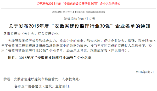 9月7日,安徽省建設監理協會官網公布了《關于發布2015年度“安徽省建設監理行業30強”企業名單的通知》,公司位居第17位。