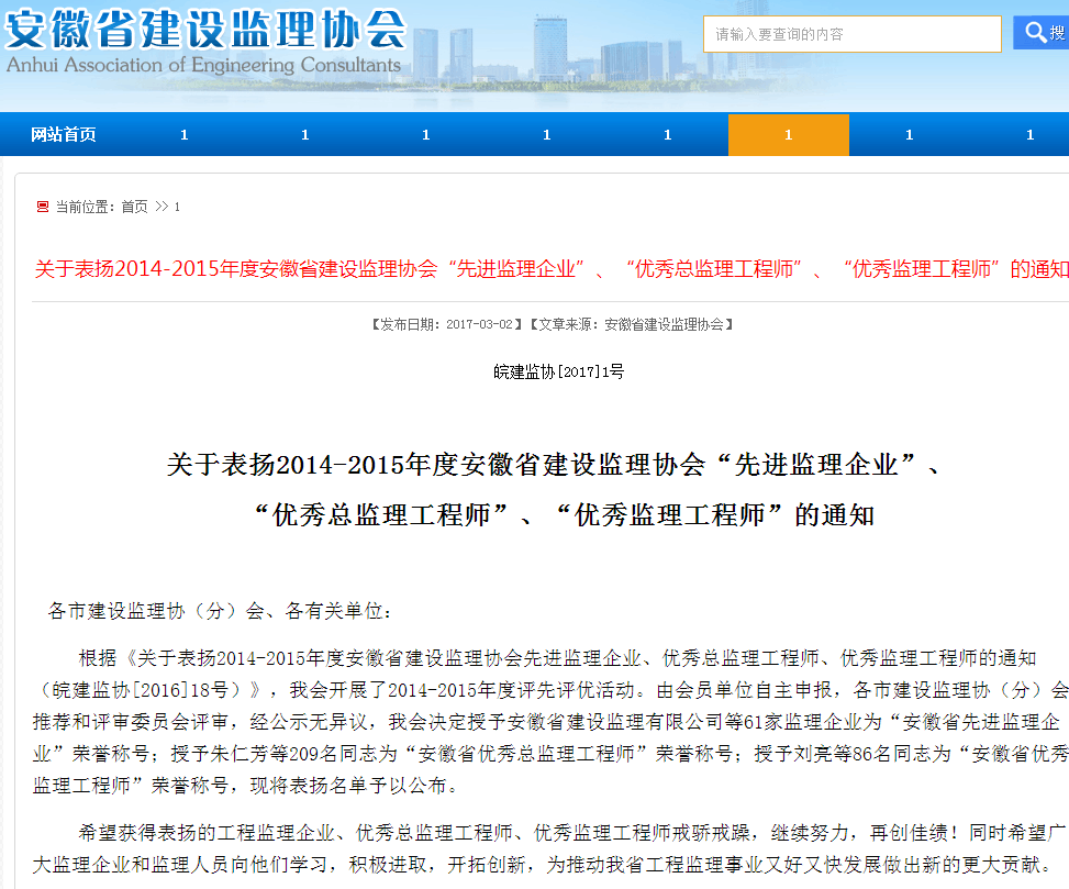 2017年3月2日,安徽省建設(shè)監(jiān)理協(xié)會官網(wǎng)發(fā)布了《關(guān)于表揚2014-2015年度安徽省建設(shè)理協(xié)會“先進監(jiān)理企業(yè)”、“優(yōu)秀總監(jiān)理工程師”、“優(yōu)秀監(jiān)理工程師”的通知》文件,公司被授予“安徽省先進監(jiān)理企業(yè)”稱號,同時三名總監(jiān)張勇、趙賢禮、翟榮春被授予“安徽省優(yōu)秀總監(jiān)理工程師”稱號。
