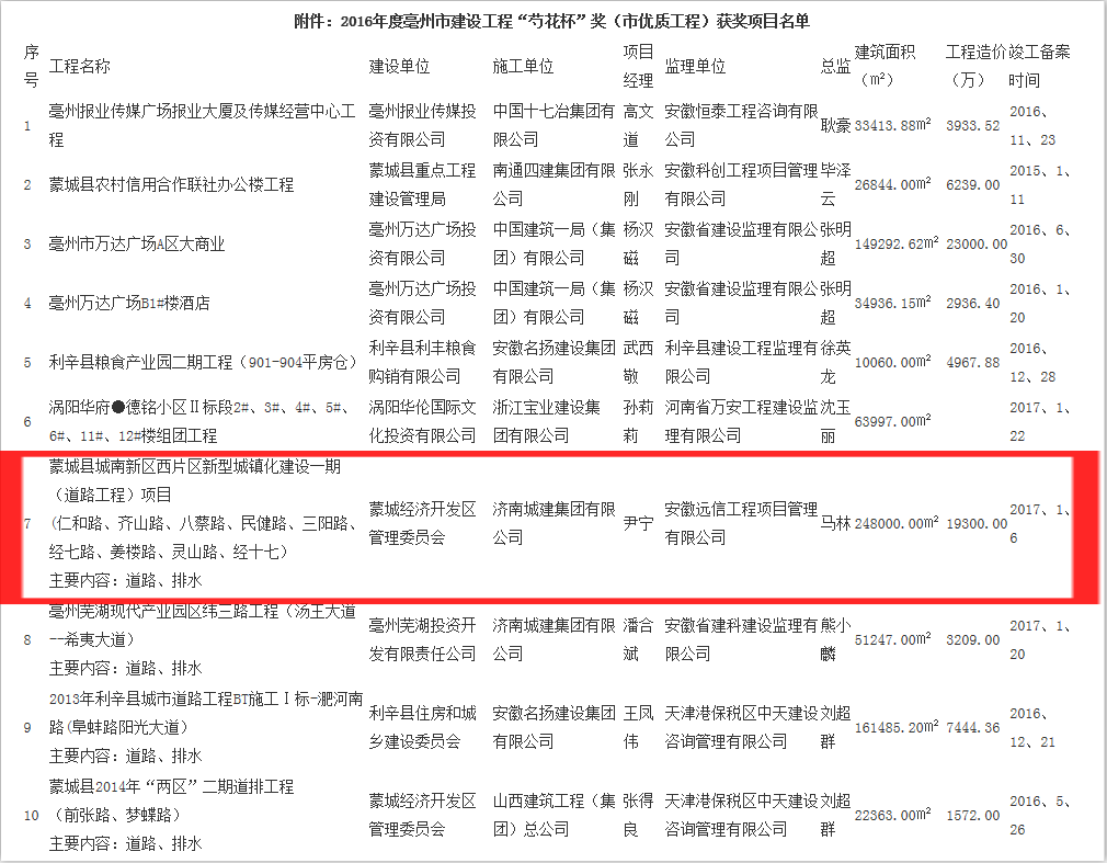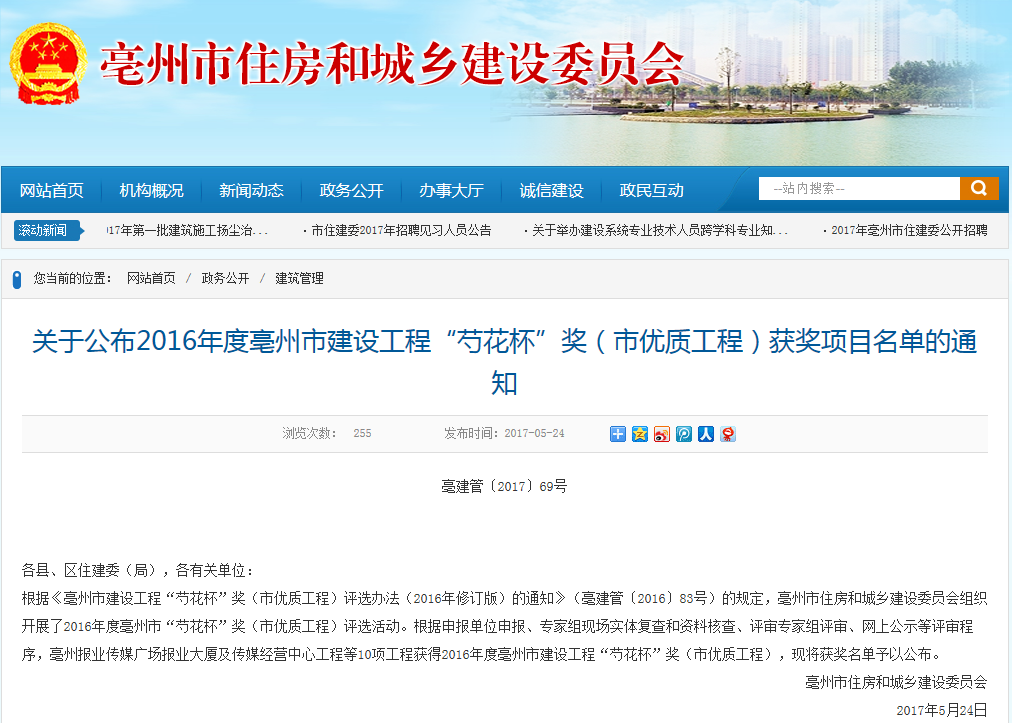 近日,亳州市住房和城鄉建設委員會網站傳來喜訊,我公司亳州項目榮獲2016年度亳州市建設工程“芍花杯”(市優質工程)獎,本次共有十項工程獲此稱號。