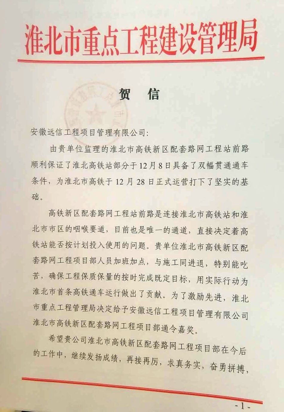 信中指出:高鐵新區配套路網工程站前路項目是連接淮北市高鐵站和淮北市區的咽喉要道,直接決定著高鐵站能否按計劃投入使用的問題。我司項目部人員加班加點,與施工同進退,用實際行動為淮北市首條高鐵通車運行做出了突出貢獻,并鼓勵該項目監理人員繼續發揚成績、再接再厲、努力做好各項工作!