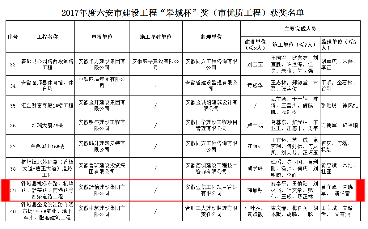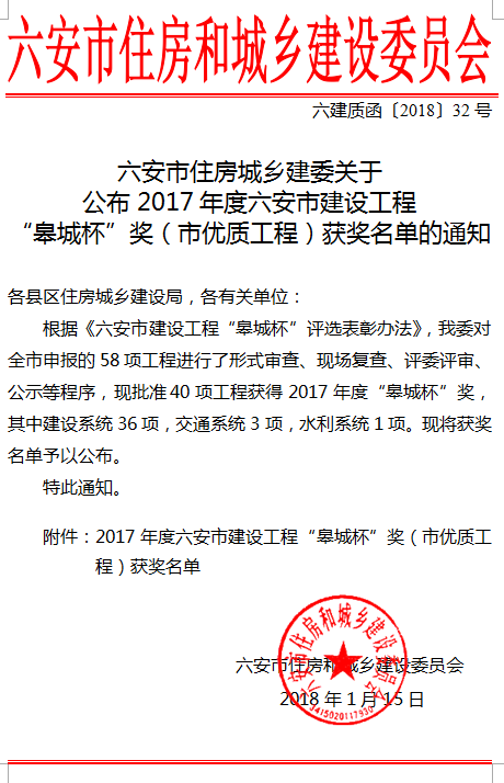 近日,六安市住房和城鄉建設委員會發文公布了2017年度六安市建設工程“皋城杯”獎(市優質工程)獲獎名單。由我司監理的舒城縣桃溪東路、杭埠路、舒茶路、南港路等四條道路工程喜獲2017年度六安市建設工程“皋城杯”獎。