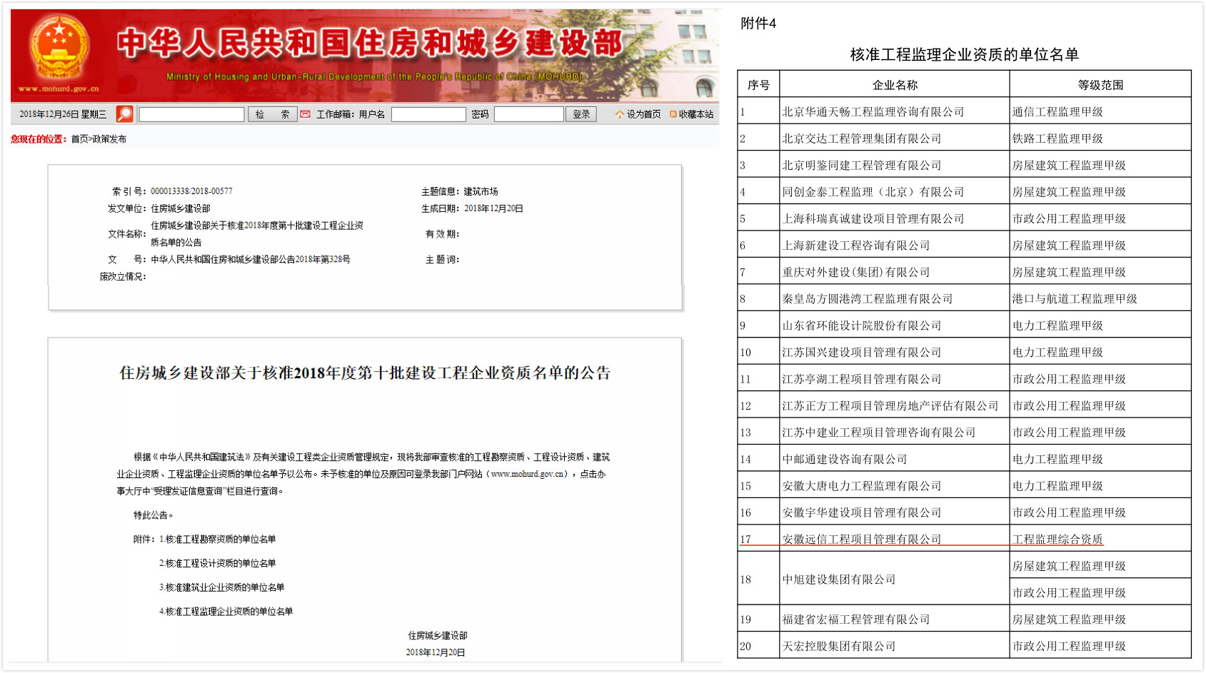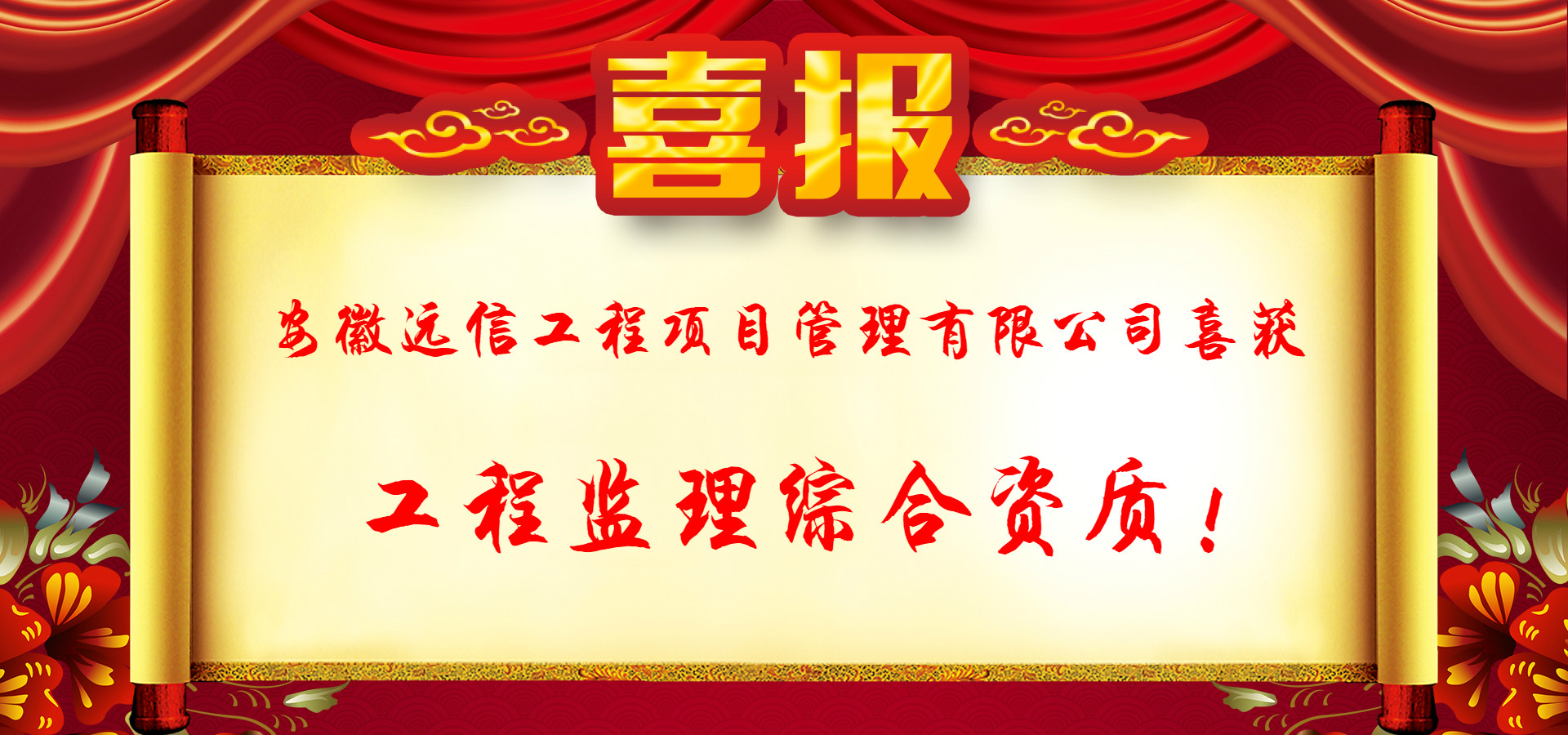 12月26日,根據住房城鄉建設部公告,公司喜獲工程監理企業資質最高級別--工程監理綜合資質。自此,安徽遠信成為安徽省第8家、全國第188家可以承擔所有級別、所有專業工程類別建設工程項目監理業務的“全能型”企業。這是全體遠信人孜孜不倦為之奮斗十余年而最終實現的戰略目標,在遠信的發展進程中具有里程碑意義。