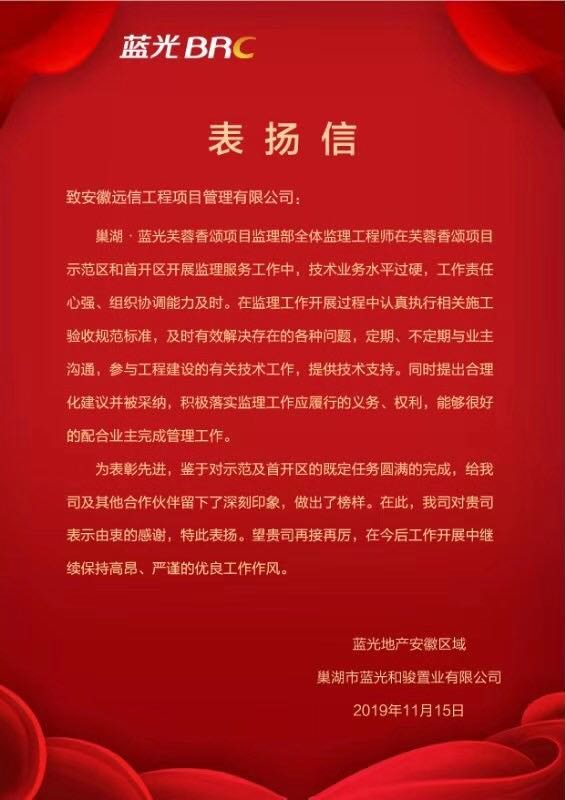 12月3日,公司巢湖藍光芙蓉香頌項目監理部收到來自藍光地產安徽區域巢湖市藍光和駿置業有限公司的錦旗和表揚信。在表揚信中,業主方對我項目監理團隊技術業務水平過硬,工作責任心強,組織協調及時方面給予了高度評價。