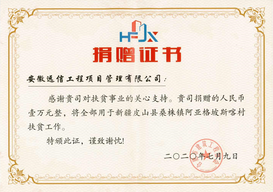 7月24日,合肥市建筑工程協(xié)會(huì)召開(kāi)新疆皮山縣桑株鎮(zhèn)阿亞格坡斯喀村對(duì)口扶貧工作表彰會(huì),安徽遠(yuǎn)信在會(huì)上受到通報(bào)表彰,同時(shí)獲頒合肥市慈善總會(huì)《捐贈(zèng)證書(shū)》、合肥市建筑工程協(xié)會(huì)表彰文件及《榮譽(yù)證書(shū)》。