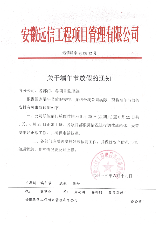 關(guān)于端午節(jié)放假通知 發(fā)布時(shí)間:2015-06-19 閱讀量:3217 上一篇:關(guān)于9月3號(hào)放假的通知下一篇:關(guān)于五一勞動(dòng)節(jié)放假通知