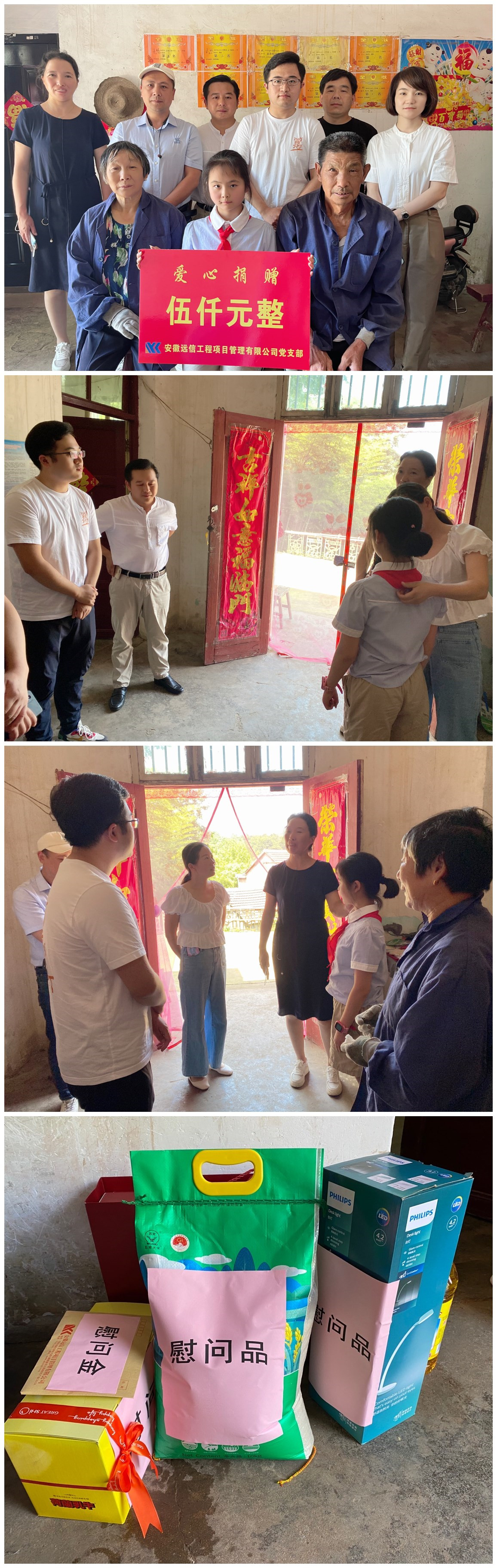 在中國共產黨成立100周年之際,為深入貫徹“學黨史、辦實事”主題活動,推進黨史學習教育走深走實,切實體現我司黨組織對困難群體的關心和愛護,6月23日上午,安徽遠信工程項目管理有限公司黨支部書記方有龍帶領公司黨員赴舒城舒茶鎮走訪慰問困難學生家庭,并送上慰問金及慰問禮品、學習用具等。