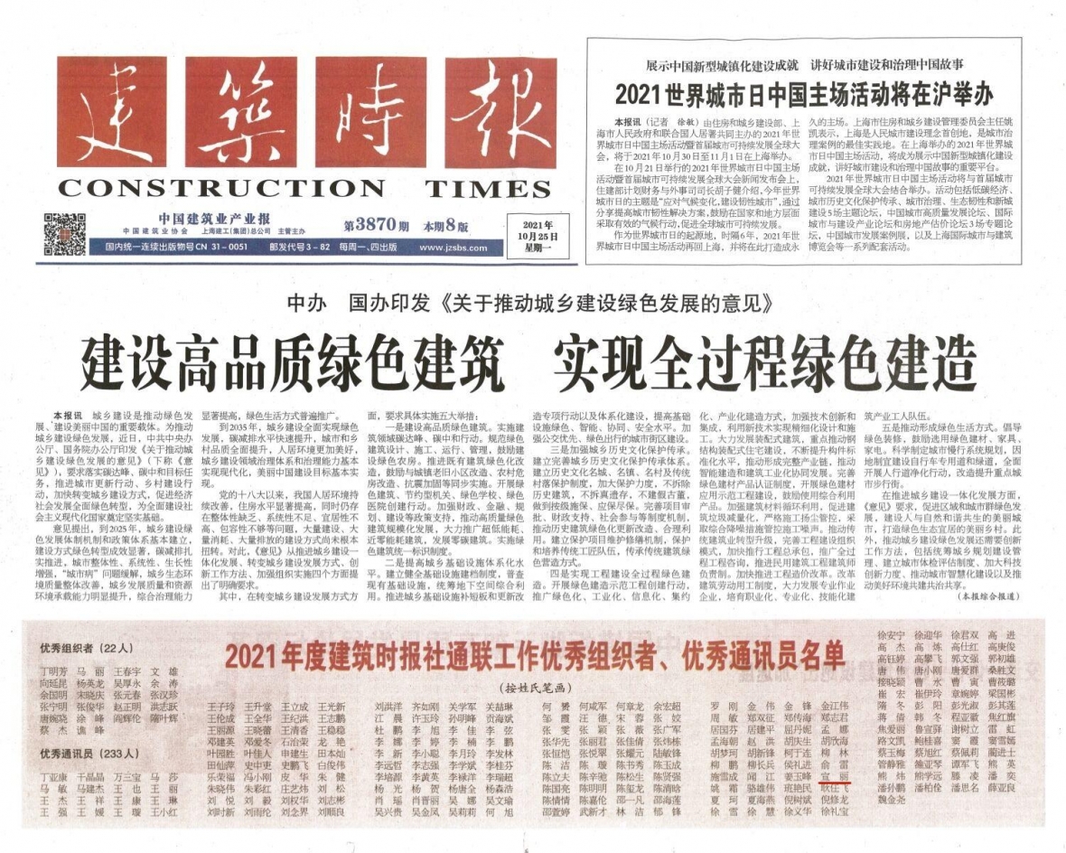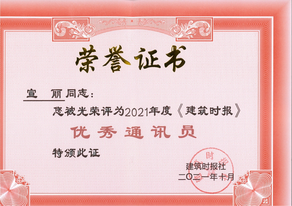 公司通聯部宣麗獲評2021年度《建筑時報》全國優秀通訊員稱號