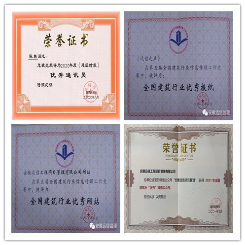 安徽遠信公司歷來注重企業文化引領,力爭塑造行業優秀品牌。自2011年以來,公司企業報、網站、微信公眾號建設工作成果豐碩。公司網站、企業報《遠信之聲》連續四年榮獲“全國建筑行業優秀網站”、“全國建筑行業優秀報紙”榮譽稱號,是唯一一家獲此殊榮的安徽省監理企業。2021年7月,全國建筑業優秀微信公眾號榜單揭曉,由我公司運營的官方微信公眾號“安徽遠信項目管理”獲得2021年全國建筑業優秀微信公眾號稱號。 諸多榮譽的取得,凝聚著每一位通聯工作者的責任和使命,傳播企業正能量,弘揚主旋律,助推公司品牌文化發展,以提升公司文化軟實力。