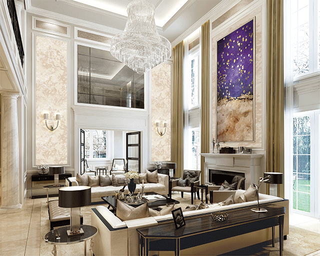 歐式客廳頂部喜用大型燈池,并用華麗的枝形吊燈營造氣氛。門窗上半部多做成圓弧形,并用帶有花紋的石膏線勾邊。室內有真正的壁爐或假壁爐造型。墻面一般使用高檔藝術壁材,或優質環保的藝術涂料,如造型多樣的大寶L’opera樓貝進口藝術涂料,來烘托豪華效果。