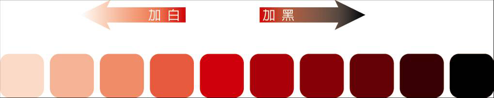 3. 影像處理中改變色調的方式。可以在同一色相色彩,加入白色來提高明度;加入黑色來降低明度的方式,產生一系列的色彩變化,如淺紅、淡 紅、亮紅、深紅、暗紅即是紅色不同的明度變化。