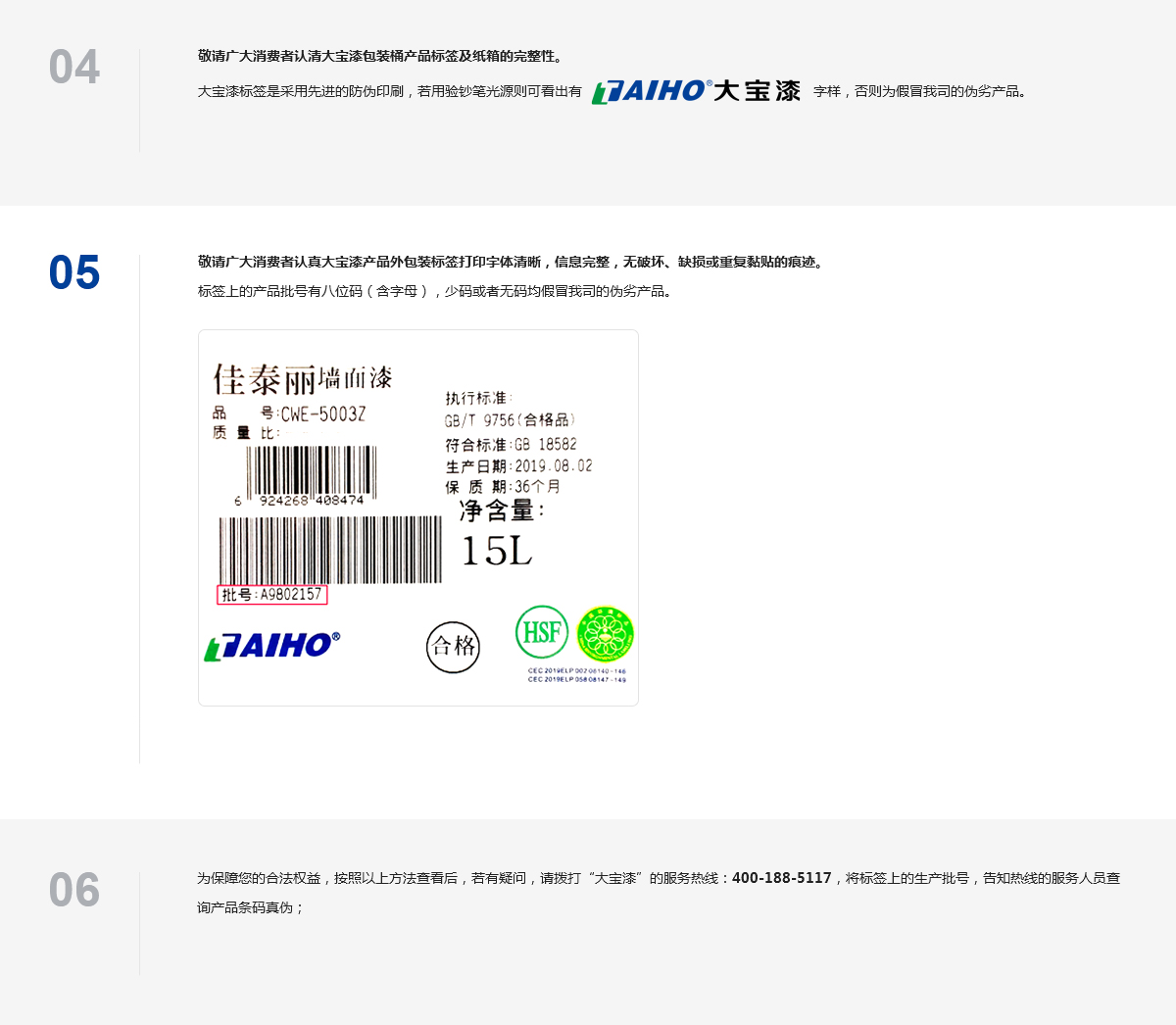 為有效防止假冒侵權產品,維護消費者權益,大寶漆所有產品都有產品標識碼,供所有消費者能明確方便地辨別出及購買到真正的大寶漆涂料,并可作為打擊假冒侵權物品的依據。以下是大寶漆涂料產品的防偽介紹: